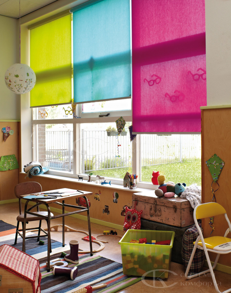 • Цвет. Выбор зависит от назначения помещения. Для игровых комнат и музыкальных залов детского сада можно выбирать яркие цветные жалюзи. Они могут быть украшенными фотопечатью с изображением героев сказок и мультфильмов, также можно выбирать растительные принты, пейзажи и другие нейтральные рисунки. Для спальни больше подойдут жалюзи или рулонные шторы с оформлением в пастельных тонах. Они должны быть неяркими, успокаивающими – это помогает создать расслабляющую обстановку.