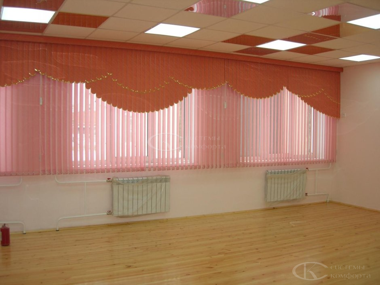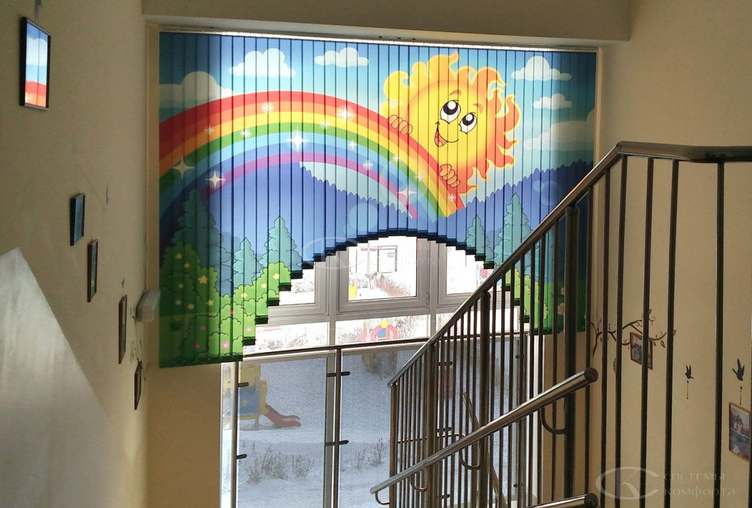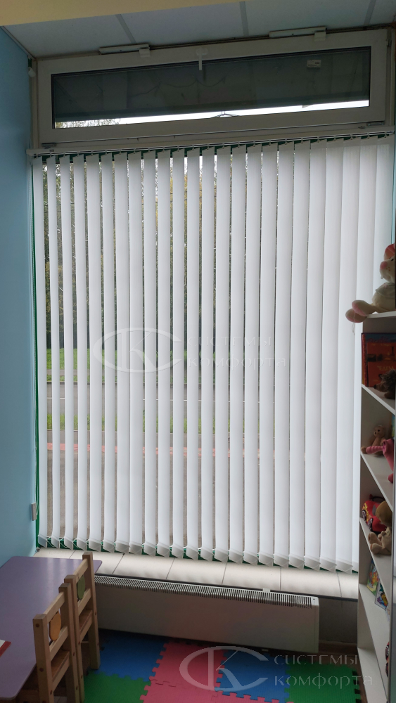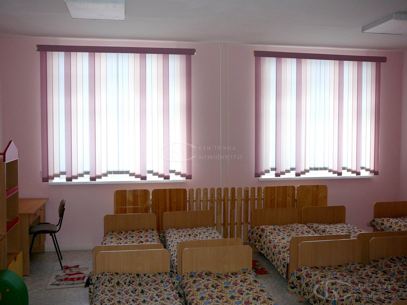• Вертикальные тканевые жалюзи. Это классический вариант, благодаря которому можно эстетично оформить окна в комнатах детского сада. Для регулировки освещенности пространства ламели поворачиваются или сдвигаются, управлять ими можно с помощью легких пластиковых цепочек или шнуров. Одно из преимуществ такого варианта – широкое дизайнерское разнообразие: можно выбирать однослойные и многослойные жалюзи, производители предлагают самую широкую цветовую гамму.