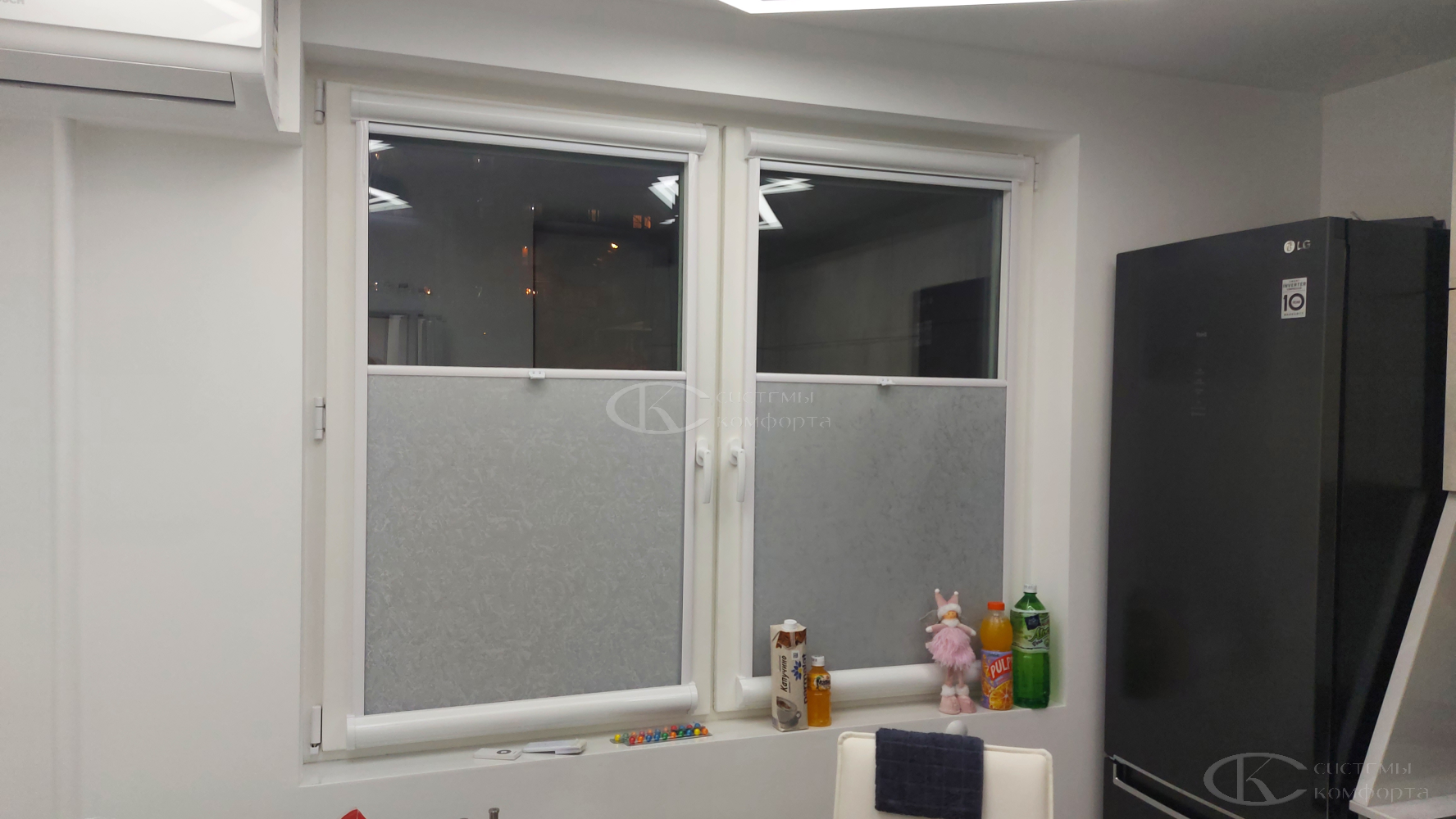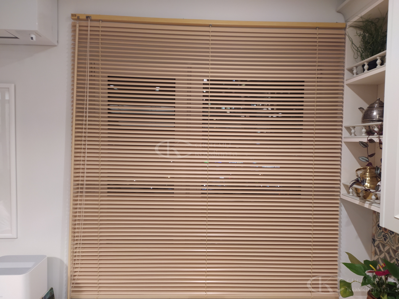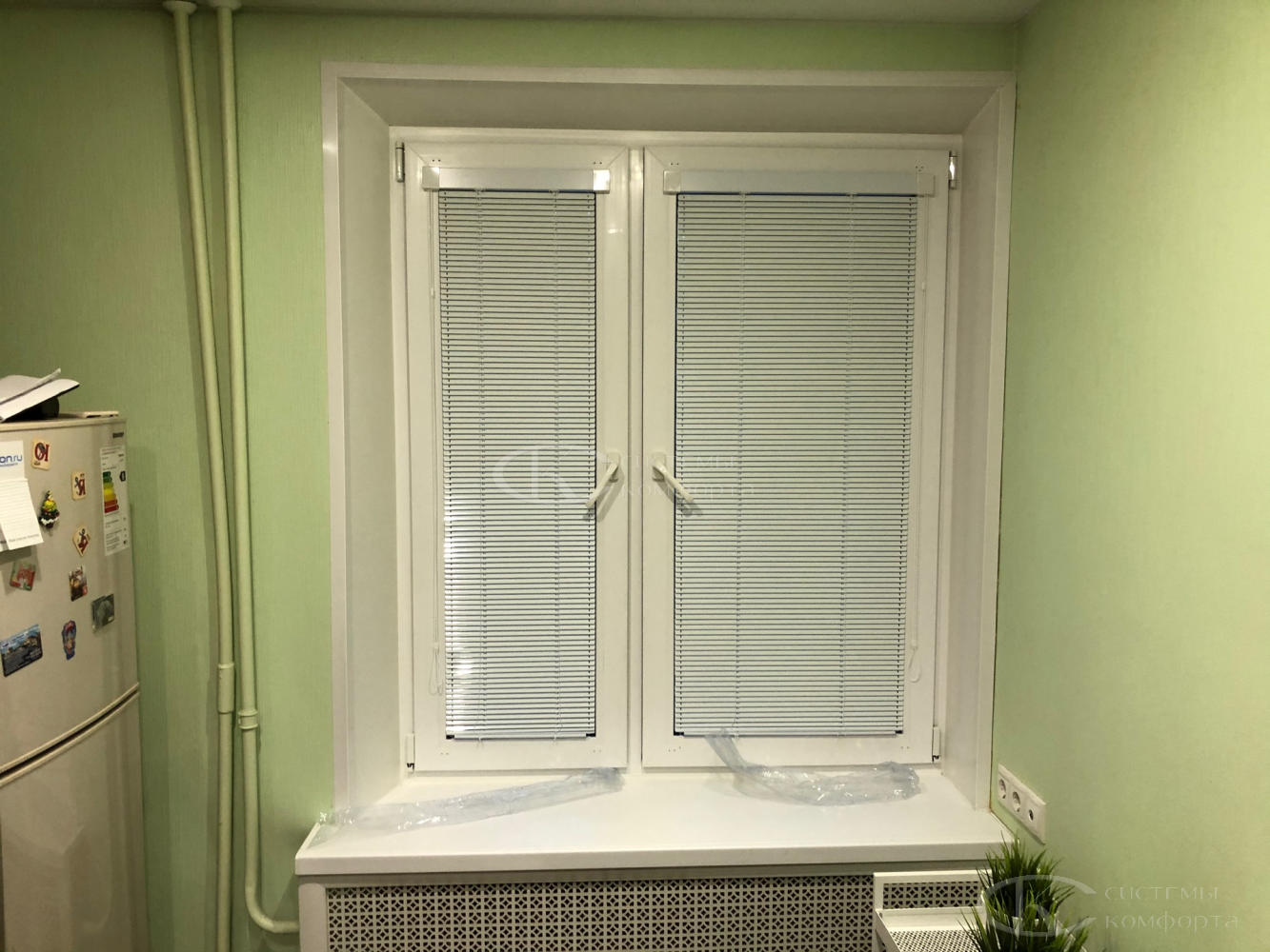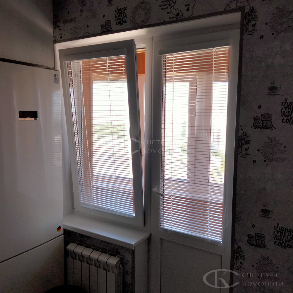В случае установки без сверления жалюзи крепятся на окно кухни с помощью двустороннего скотча. Низ фиксируется небольшими магнитами. Такой вариант подходит для легких моделей.